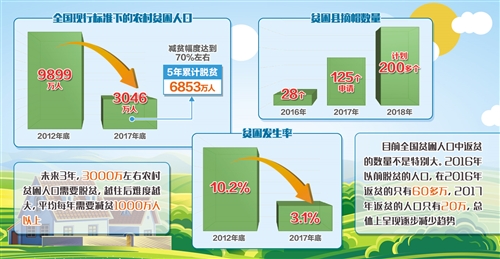 在以習(xí)近平同志為核心的黨中央堅強領(lǐng)導(dǎo)下,脫貧攻堅力度之大、規(guī)模之廣、影響之深前所未有。經(jīng)過幾年的努力,脫貧攻堅取得決定性進展:全國現(xiàn)行標準下的農(nóng)村貧困人口由2012年底的9899萬人,減少到2017年底的3046萬人,5年累計脫貧6853萬人,減貧幅度達到70%左右。貧困發(fā)生率由2012年底的10.2%下降到2017年底的3.1%。貧困縣數(shù)量實現(xiàn)了首次減少,2016年有28個貧困縣脫貧摘帽,2017年有125個貧困縣申請摘帽,今年計劃200多個縣摘帽,解決區(qū)域性整體貧困邁出堅實步伐。貧困地區(qū)群眾生產(chǎn)生活條件明顯改善,貧困群眾收入水平明顯提高、獲得感明顯增強。