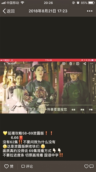 《延禧攻略》《如懿傳》等影視劇正在熱播,劇迷們的追劇熱情持續(xù)高漲,每天盼著劇集更新成為常態(tài)。以《延禧攻略》為例,截至8月23日上午,劇集已更新至56集,在部分視頻網(wǎng)站上充值成為會員后,可以觀看至64集。但近日,有不少網(wǎng)友發(fā)現(xiàn),網(wǎng)上出現(xiàn)了銷售《延禧攻略》未播劇集的商家。購買資源后,可以直接觀看至68集。