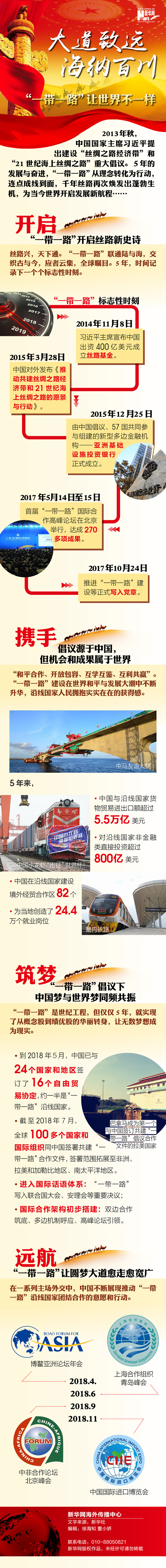 5年的發(fā)展與奮進(jìn),“一帶一路”從理念轉(zhuǎn)化為行動(dòng),連點(diǎn)成線到面,在廣袤大陸上落地生根,在浩瀚海洋中乘風(fēng)破浪,千年絲路再次煥發(fā)出蓬勃生機(jī),為當(dāng)今世界開(kāi)啟發(fā)展新航程……