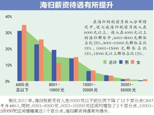 22日,某招聘網站與某智庫機構聯合發布了《2018中國海歸就業創業調查報告》,重點反映了以“90后”為主的新生代海歸群體在留學前后的發展變化。與去年相比,今年調查的海歸就業競爭力及薪酬均有提升,近七成海歸稅前月收入在6000元以上,月收入在10001~20000元區間的增幅達7個百分點。