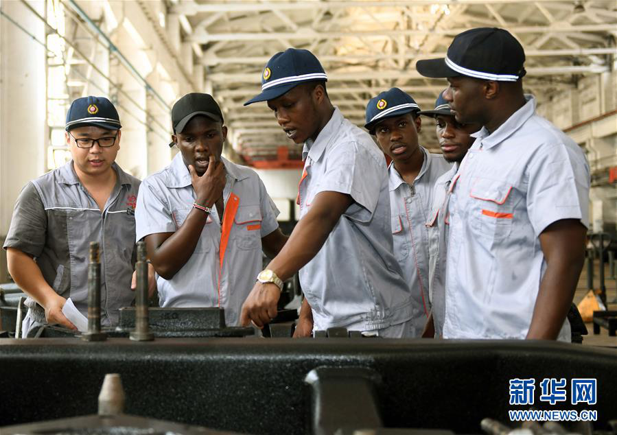 2018年7月24日,來自肯尼亞的留學生在中國鐵路濟南局集團有限公司濟南車輛段車間聽中國工程師(左一)講解火車底盤構造。? 新華社記者 朱崢 攝
