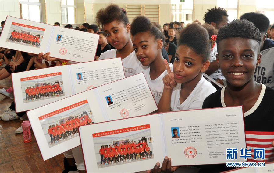 2016年6月12日,河北吳橋雜技藝術學校的埃塞俄比亞留學生展示結業證書。? 新華社發(苑立偉 攝)
