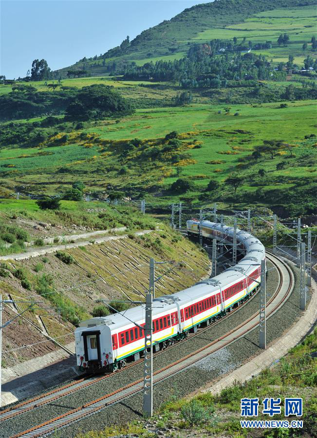 2016年10月3日,在埃塞俄比亞首都亞的斯亞貝巴附近,一列試運行列車在亞吉鐵路上行駛。2016年10月5日,由中國企業建設、連接埃塞俄比亞和吉布提兩國首都的亞的斯亞貝巴-吉布提鐵路(亞吉鐵路)正式通車,成為非洲第一條電氣化鐵路。? 新華社記者李百順攝