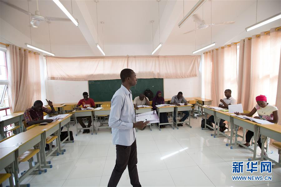 2018年7月18日,庫馬克·巴胡姆(中文名字巴虹)(前)在塞內加爾達喀爾大學孔子學院教中文課。目前,達喀爾大學孔子學院已有3名在崗本土中文教師,他們以生動、易懂的方式在塞內加爾傳播中國文化,講述中國故事。 新華社記者呂帥攝