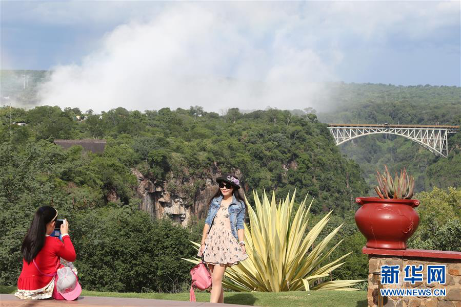 2017年1月27日,在津巴布韋維多利亞瀑布城,來自中國的一對母女以遠處的贊比西鐵橋為背景拍照留念。近年來,春節假期期間前往非洲旅游的中國游客逐漸增多。? 新華社發(費列蒙攝)