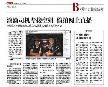 北京天馳君泰律師事務所律師劉玲認為,除了對道路安全可能造成的危害后果,司機在乘客不知情的情況下,擅自對其進行網絡直播,侵犯了乘客的隱私權,根據《中華人民共和國侵權責任法》的規定,侵害公民隱私權等民事權益,應當依照本法承擔侵權責任。(記者 劉名洋 陳維城 實習生 張贏)
