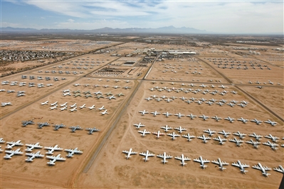 美國亞利桑那州的一片沙漠中,坐落著“航空航天維護與再生中心”。這里封存著美國大部分退役飛機,被稱為“飛機墳場”。這些總價值達350億美元的退役報廢飛機,幾乎涵蓋了二戰以后美軍所有軍用飛機機型。駐扎在那里的美軍,每天都會對封存的飛機進行維護,時刻準備讓其中一些重返藍天。