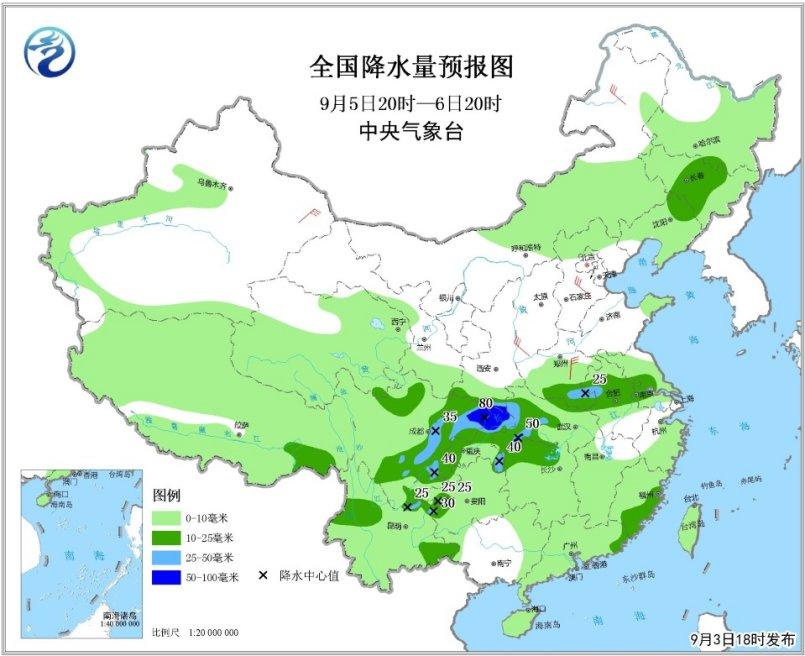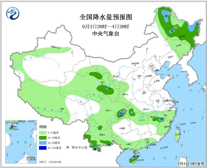 另外,9月3日夜間至4日白天,云南西部和南部、廣西南部沿海、四川盆地東部和南部、海南島和雷州半島、江西東部、福建西北部和東部沿海等地的部分地區有中到大雨,局地有暴雨;上述部分地區伴有短時強降水(小時雨量20~40毫米),局地有雷暴大風等強對流天氣。