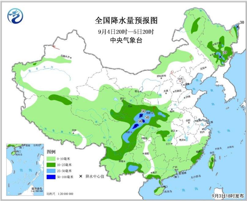 圖2 全國降水量預報圖(9月3日20時-4日20時)