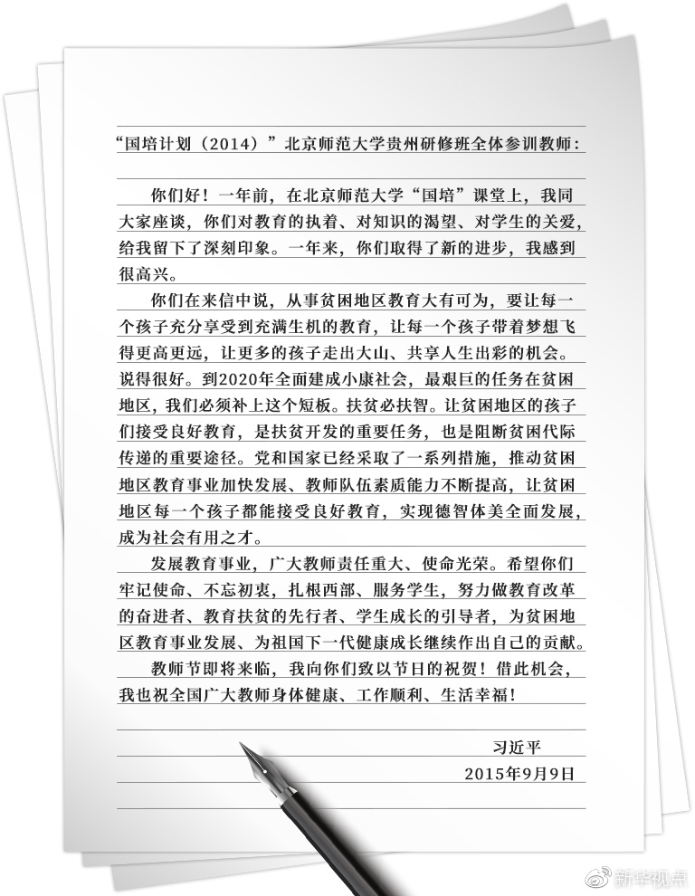 “要讓每一個(gè)孩子充分享受到充滿生機(jī)的教育,讓每一個(gè)孩子帶著夢(mèng)想飛得更高更遠(yuǎn),讓更多的孩子走出大山、共享人生出彩的機(jī)會(huì)。”2015年,“國(guó)培計(jì)劃(2014)”北師大貴州研修班全體參訓(xùn)教師在給習(xí)近平總書記的信中這樣寫道。