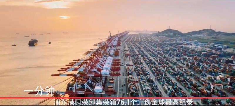 一分鐘,浦東港口裝卸集裝箱76.1個,全年集裝箱年吞吐量近4000萬標(biāo)箱,創(chuàng)全球港口集裝箱運(yùn)輸史最高紀(jì)錄。