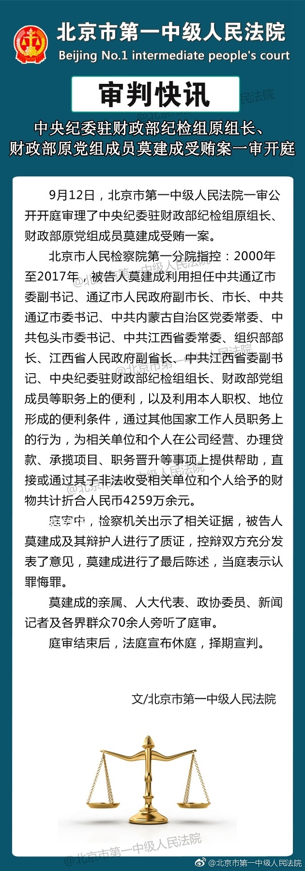 據(jù)北京市第一中級人民法院官方微博消息,9月12日,北京市第一中級人民法院一審公開開庭審理了中央紀委駐財政部紀檢組原組長、財政部原黨組成員莫建成受賄一案。