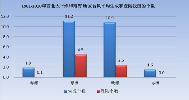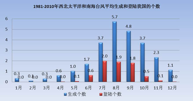 圖2 1981-2010年西北太平洋和南海地區臺風平均生成和登陸我國的個數 李慧 制圖