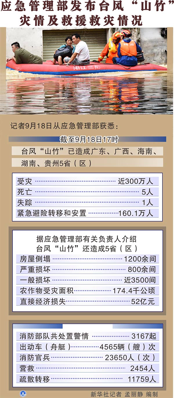 新華社北京9月18日電(記者葉昊鳴)記者18日從應急管理部獲悉,截至18日17時,臺風“山竹”已造成廣東、廣西、海南、湖南、貴州5省(區)近300萬人受災,5人死亡,1人失蹤,160.1萬人緊急避險轉移和安置。