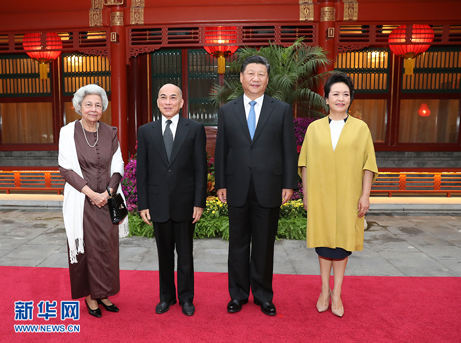 9月19日,在中秋佳節來臨之際,國家主席習近平和夫人彭麗媛在釣魚臺國賓館親切看望正在北京休養的柬埔寨國王西哈莫尼和太后莫尼列。新華社記者 黃敬文 攝