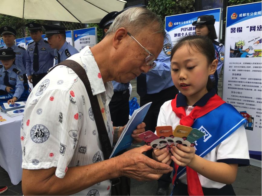 “如果收到信息,說您的家人受傷需要匯款,肯定是詐騙電話。卡片后面有四個詐騙的典型案例,爺爺您可以了解一下。”少城小學四年級的李彥孜一邊拿著精巧可愛的網絡安全知識熊貓書簽,一邊用稚嫩的聲音做介紹。李彥孜是宣傳網絡安全的小志愿者,她告訴傳播君,這些網絡安全知識都是用課余時間去了解的,“多一個人知道,就少一個人受害”。