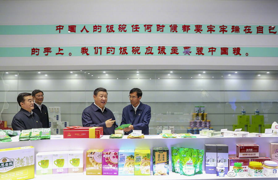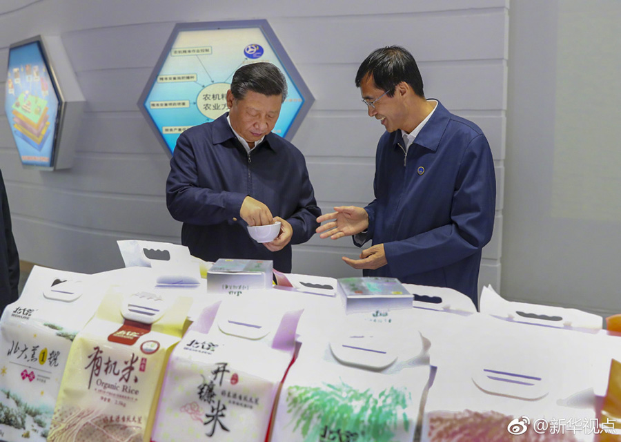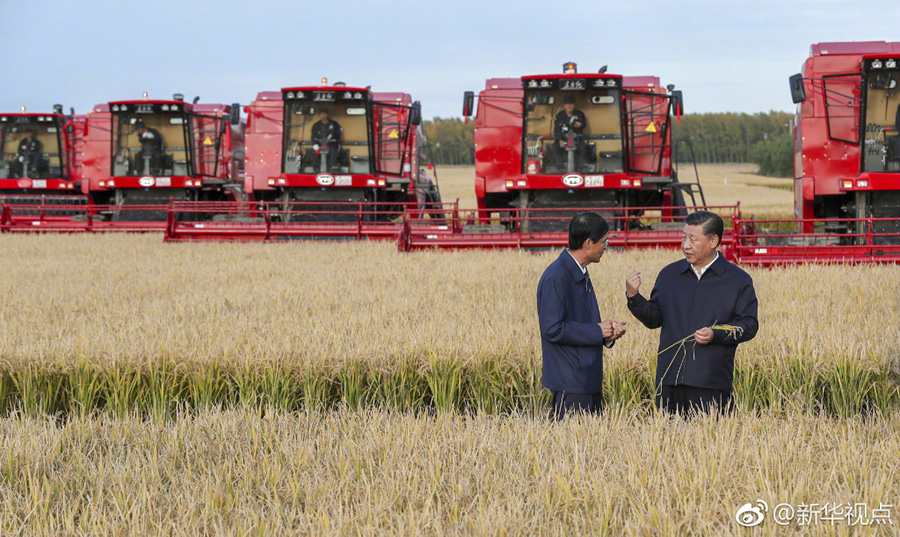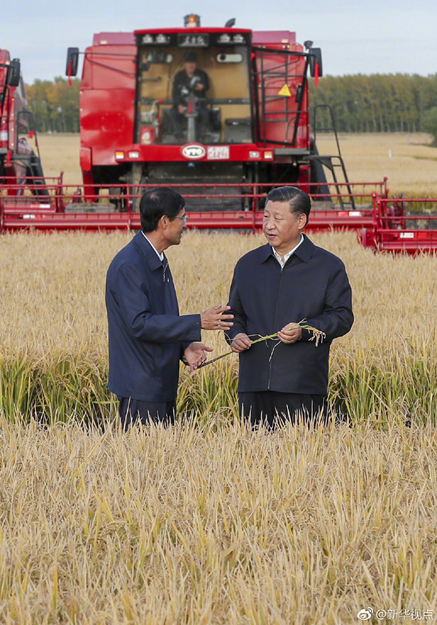 25日下午,首個(gè)“中國(guó)農(nóng)民豐收節(jié)”剛過(guò),習(xí)近平就深入三江平原腹地黑龍江農(nóng)墾建三江管理局,考察糧食生產(chǎn)和收獲情況。他邊聽(tīng)介紹,邊向農(nóng)場(chǎng)負(fù)責(zé)人詢(xún)問(wèn)今年收成如何、有沒(méi)有病蟲(chóng)害、能否做到連年豐收,并強(qiáng)調(diào)中國(guó)人的飯碗任何時(shí)候都要牢牢端在自己的手上。在北大荒精準(zhǔn)農(nóng)業(yè)農(nóng)機(jī)中心一樓大廳,當(dāng)?shù)爻霎a(chǎn)的米油豆奶等各類(lèi)農(nóng)產(chǎn)品擺滿展臺(tái)。習(xí)近平走近前去,雙手捧起一碗大米,意味深長(zhǎng)地說(shuō):“中國(guó)糧食,中國(guó)飯碗?!保ㄎ淖郑簭垥运?攝影:謝環(huán)馳)
