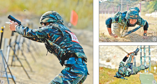 圖①:9月25日,在極限運動搜索射擊課目中,參賽隊員在進行手槍射擊。 圖②:9月26日,參賽隊員在比賽中穿越障礙物。圖③:9月26日,在個人全能課目中,參賽隊員利用鐵索進行橫渡。曹 峰攝(人民視覺)