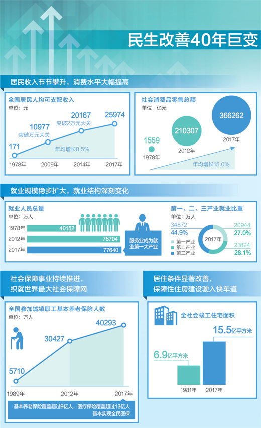 改革開(kāi)放40年,是我國(guó)經(jīng)濟(jì)飛速發(fā)展、經(jīng)濟(jì)總量連上新臺(tái)階的40年,也是全體人民共享改革發(fā)展成果、生活水平大幅提高的40年。黨的十八大以來(lái),以習(xí)近平同志為核心的黨中央堅(jiān)持以人民為中心的發(fā)展思想,統(tǒng)籌做好就業(yè)、收入分配、社會(huì)保障、醫(yī)療衛(wèi)生等各領(lǐng)域民生工作,城鄉(xiāng)居民生活向全面小康社會(huì)更加扎實(shí)地邁進(jìn)。人民群眾的獲得感、幸福感、安全感更充實(shí)、更有保障、更可持續(xù)。