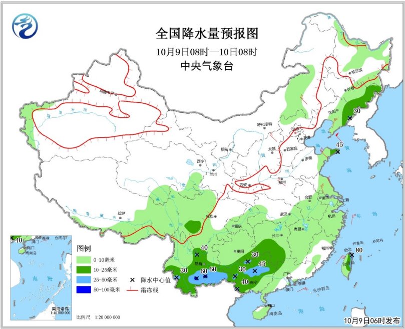 張博:此輪冷空氣是國慶前期冷空氣的補充冷空氣,9日至10日,受補充冷空氣影響,西北地區東北部、華北、東北中南部、黃淮、江淮、江南東部等地有4~6級偏北風,氣溫將下降4~6℃。預計本輪冷空氣將于明日(10日)結束,后期我國中東部地區氣溫會有小幅回升。受其影響,9日至11日,東北地區中東部有雨雪天氣,其中,吉林東部、黑龍江東南部部分地區有中到大雪,局地暴雪。