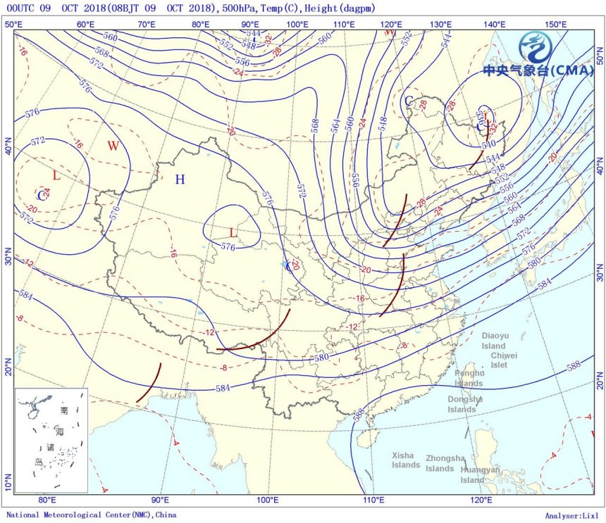 圖為2018年10月9日08時500hPa高度場實況