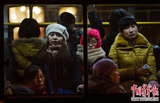北京街頭的公交車上,身陷下班晚高峰的人們,日復一日地忍耐著通勤壓力。記者 鄭萍萍/攝