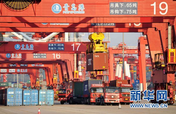 10月12日,車輛在山東青島港外貿集裝箱碼頭裝運集裝箱。 新華社發(俞方平 攝)