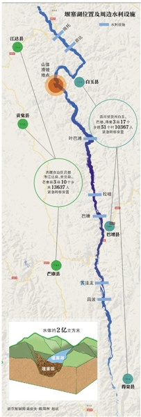 據范曉介紹,金沙江堰塞湖的山體滑坡處在西藏的峽谷一帶,地差比較大,兩岸陡峭,且因巖石構造原因,該地帶是山體滑坡崩塌高發地。而這次金沙江堰塞湖的形成,主要是滑坡土量達約2500萬立方米,進而把河道堵塞形成堰塞體,堰塞體堵截河道形成堰塞湖。