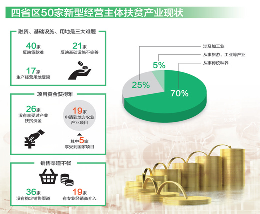 據調查,受訪的50家新型經營主體中,80%的主體反映“差錢”。資金難是扶貧產業發展的主要瓶頸。