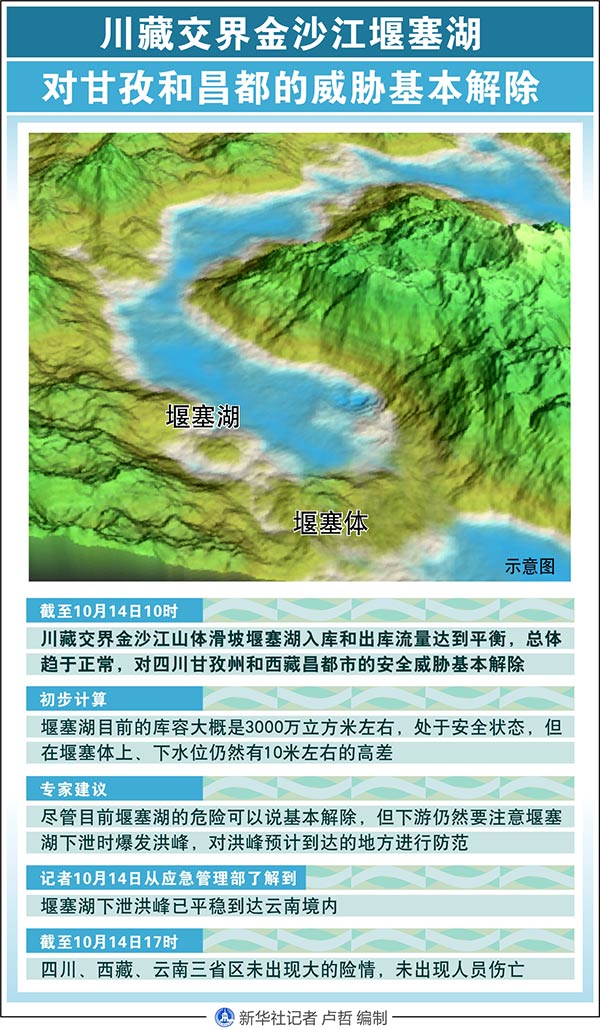 新華社成都10月14日電(記者 薛文獻、春拉)截至14日10時,川藏交界金沙江山體滑坡堰塞湖入庫和出庫流量達到平衡,總體趨于正常,對四川甘孜州和西藏昌都市的安全威脅基本解除。