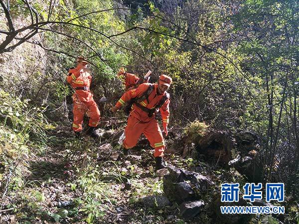 先遣隊員向山體滑坡核心區挺進(10月11日攝)。 新華社發(夏能 攝)