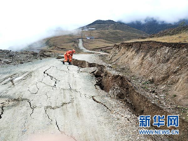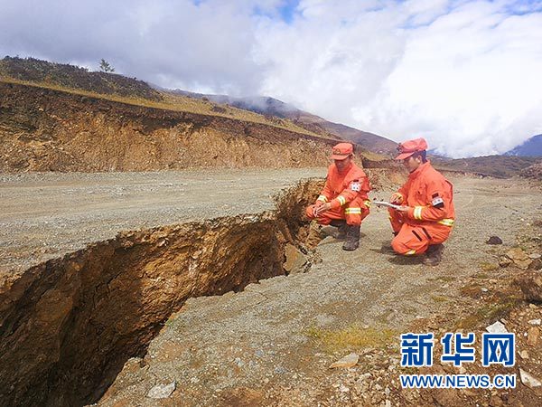 先遣隊員在波公村勘察地質災害情況(10月13日攝)。 新華社發(夏能 攝)