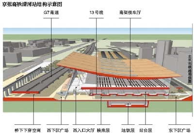 據介紹,車站由地下兩層、地上兩層、局部三層組成。其中,地下二層為城鐵昌平南延線及19號線支線站臺層及設備層;地下一層為城市通廊、高鐵與地鐵換乘空間、地下車庫;首層為高鐵進站廳、站臺層和城鐵13號線站臺;二層為高架候車大廳,局部三層為商業服務場所。站臺設5臺10線。