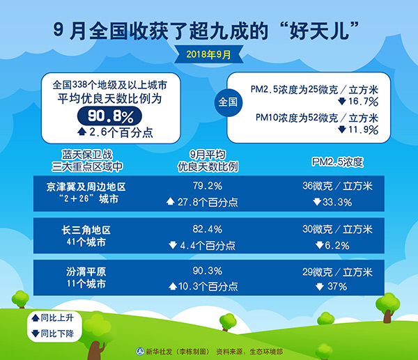 新華社北京10月18日電(記者高敬)生態環境部有關負責人18日通報,今年9月,全國338個地級及以上城市平均優良天數比例為90.8%,同比上升2.6個百分點。