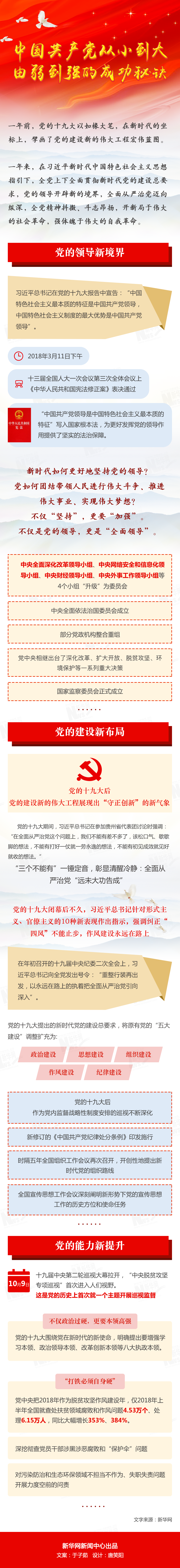 一年來,在習近平新時代中國特色社會主義思想指引下,全黨上下全面貫徹新時代黨的建設總要求,黨的領導開辟新的境界,全面從嚴治黨邁向縱深,全黨精神抖擻、斗志昂揚,開新局于偉大的社會革命,強體魄于偉大的自我革命。