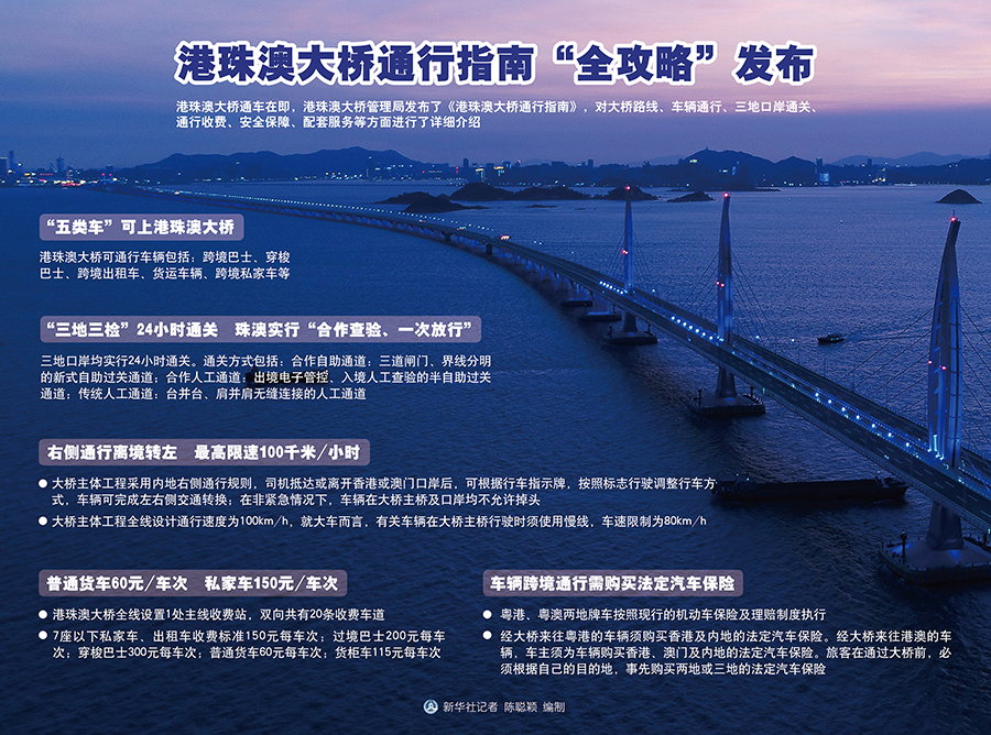 新華社廣州10月21日電(記者 周強)港珠澳大橋通車在即,港珠澳大橋管理局發布了《港珠澳大橋通行指南》,對大橋路線、車輛通行、三地口岸通關、通行收費、安全保障、配套服務等方面進行了詳細介紹。