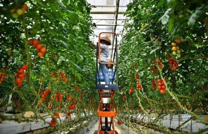 在海南省陵水現(xiàn)代農(nóng)業(yè)示范基地,工人在管理通過(guò)擱架吊蔓式栽培技術(shù)種植的詹妮瑞番茄。新華社記者 郭程 攝