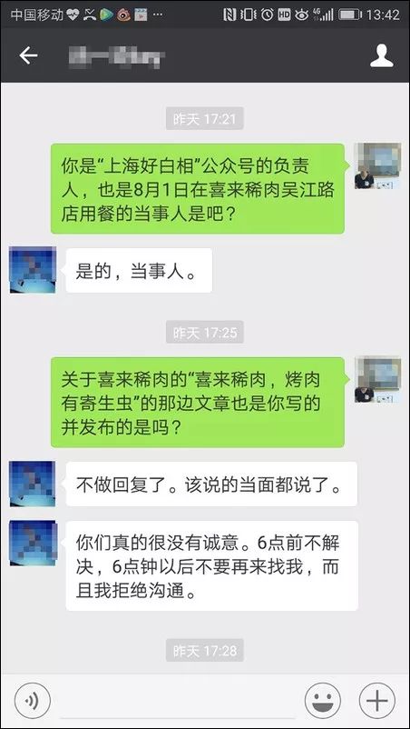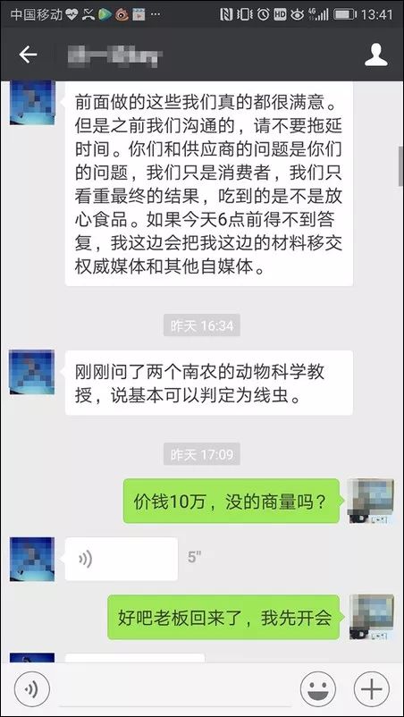 為此,“喜來稀肉”微信公眾號8月2日發(fā)文稱,那不是寄生蟲,而是豬血管。并稱公司已經(jīng)和上述微信公眾號溝通,接洽的“徐先生”提出要10萬元封口費,下午六點前到賬,否則將再次發(fā)送推文。事后查明,“喜來稀肉”豬肉沒問題,而公司也向“上海好白相”提出8萬元的索賠。?
