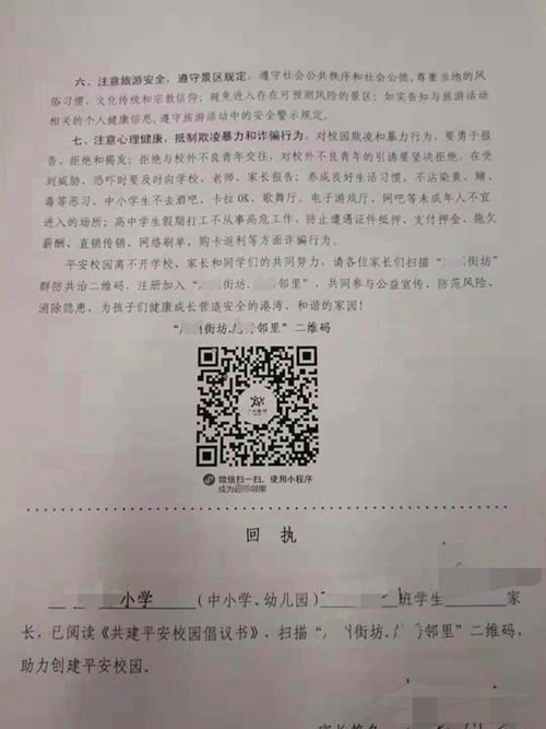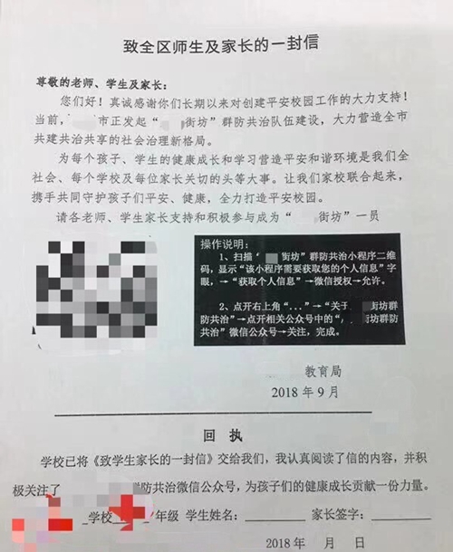 前不久,廣東某地發起“街坊群防共治隊伍建設”,并開設了微信公眾號。當地教育局以《致全區師生及家長的一封信》的形式,要求師生和家長關注其公眾號,并要求學生及家長簽名承諾“關注”。