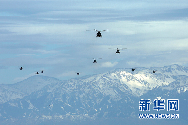 2018年1月5日,新疆軍區某陸航旅運輸直升機一營在嚴寒條件下組織飛行訓練。 新華社發(吳世科 攝)