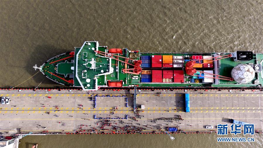 11月2日,“雪龍”號停泊在位于上海的中國極地考察國內(nèi)基地碼頭準備起航(無人機拍攝)。新華社記者 劉詩平攝