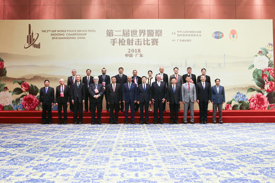 11月13日,公安部常務(wù)副部長(zhǎng)、第二屆世界警察手槍射擊比賽組委會(huì)名譽(yù)主席王小洪在廣州同來(lái)華出席比賽開幕式的國(guó)際警察體育聯(lián)合會(huì)和各國(guó)執(zhí)法部門官員合影。