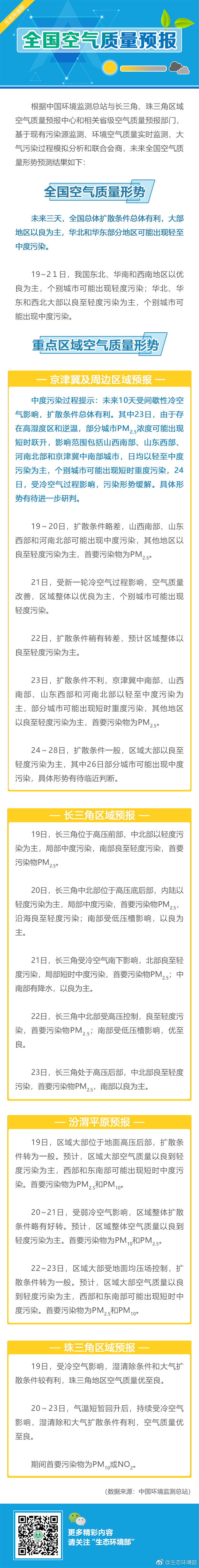 據生態環境部官方微博消息,未來三天(11月19-21日),全國總體擴散條件總體有利,大部地區以良為主,華北和華東部分地區可能出現輕至中度污染。