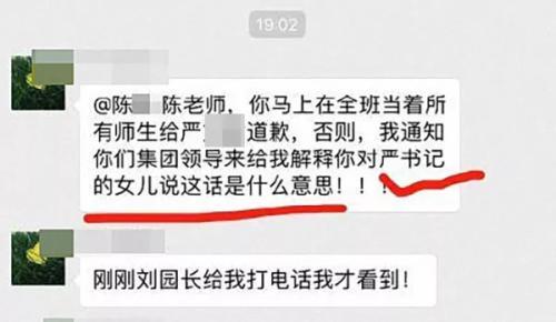 隨后,群內署名為“嚴某某媽媽”的人士發言稱,“陳老師,你馬上在全班當著所有師生給嚴某某道歉,否則,我通知你們集團領導來給我解釋你對嚴書記的女兒說這話是什么意思!”后又稱學校已將該老師開除。