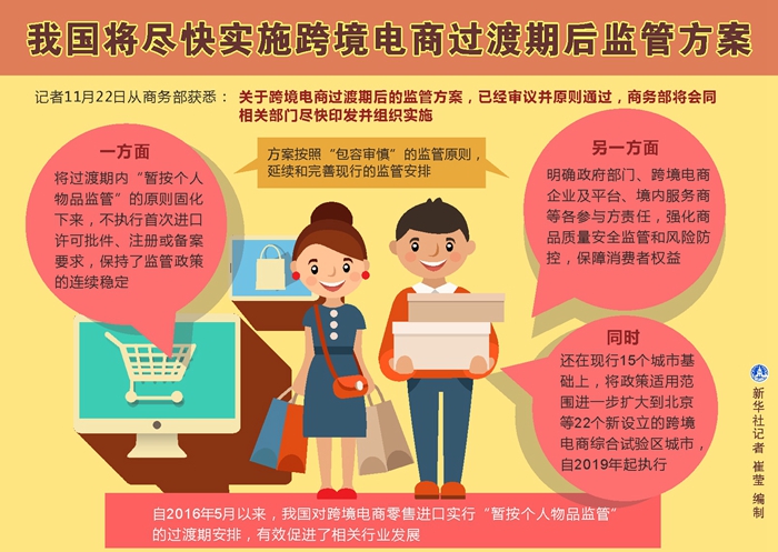 新華社北京11月22日電(記者于佳欣)記者22日從商務(wù)部獲悉,關(guān)于跨境電商過渡期后的監(jiān)管方案,已經(jīng)審議并原則通過,商務(wù)部將會(huì)同相關(guān)部門盡快印發(fā)并組織實(shí)施。