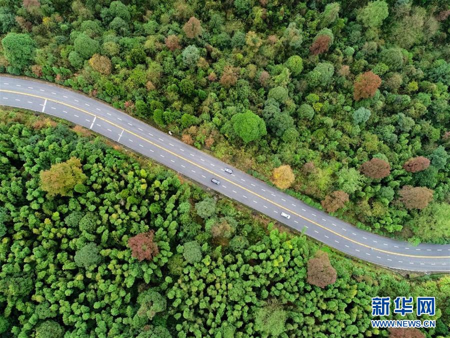 車輛行駛在國家第一條四車道盤山公路泰井高速上(11月21日無人機拍攝)。 新華社記者 胡晨歡 攝