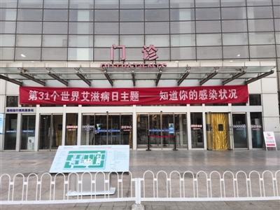 世界艾滋病日到來之際,地壇醫(yī)院在門診樓掛起條幅。