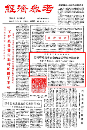 這是《經濟參考報》的創刊號。在頭版《要用管理集體企業的辦法管理全民企業》一文中,時任天津市市長胡啟立表示,“吃大鍋飯”的經濟管理體制已走進死胡同。如果用管理集體企業的辦法來管理全民企業,浪費會大大減少,國家收入會大大增加,職工生活會大大改善,這是明擺著的事情。在這個問題上,誰覺悟得早誰主動;誰還在老框框里吃“大鍋飯”,誰就被動。