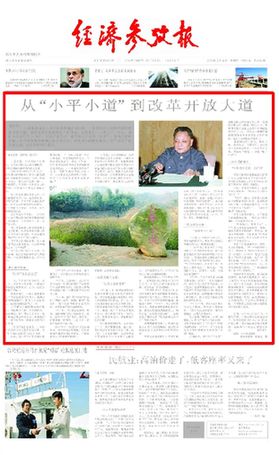 2008年,也是中國改革開放30周年,《經濟參考報》刊發《從“小平小道”到改革開放大道》。當年,受到錯誤批判的鄧小平同志被疏散到江西新建縣拖拉機廠勞動。在這條原本不是路、工友們為了讓他不繞遠路而悄悄修整出來的田邊小路上,鄧小平徘徊了三年、思考了三年。當鄧小平重新登上中國政治舞臺中心的時候,他帶領全國人民走上了一條沒有前人經驗借鑒的改革開放大道。