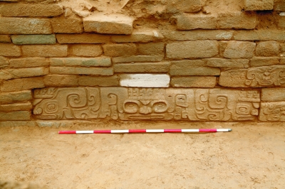 皇城臺為一處四圍包砌石砌護墻的高阜臺地,位于內城中部偏西。皇城臺臺頂的一些大型建筑坐落在一處大型臺基上。2018年,從這處大臺基南護墻倒塌的墻體石塊內,考古隊出土了30余件石雕作品,有一些石雕還鑲嵌在南護墻墻面上。這些石雕絕大多數是雕刻于石塊一面的單面雕刻,有符號、人面、神面、動物、神獸等,有一些畫面長度近3米,以中心正臉的神面為中心,兩側對稱雕出動物和側臉人面,體現出成熟的藝術構思和精湛的雕刻技藝。